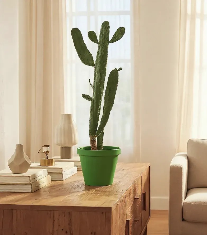 Bring home the striking beauty of the Opuntia, also known as the Prickly Pear Cactus. With its tall, paddle-shaped cladodes and unique desert charm, this cactus is both decorative and resilient. Standing at 70–80 cm tall, it makes a bold statement in modern interiors, patios, or gardens.